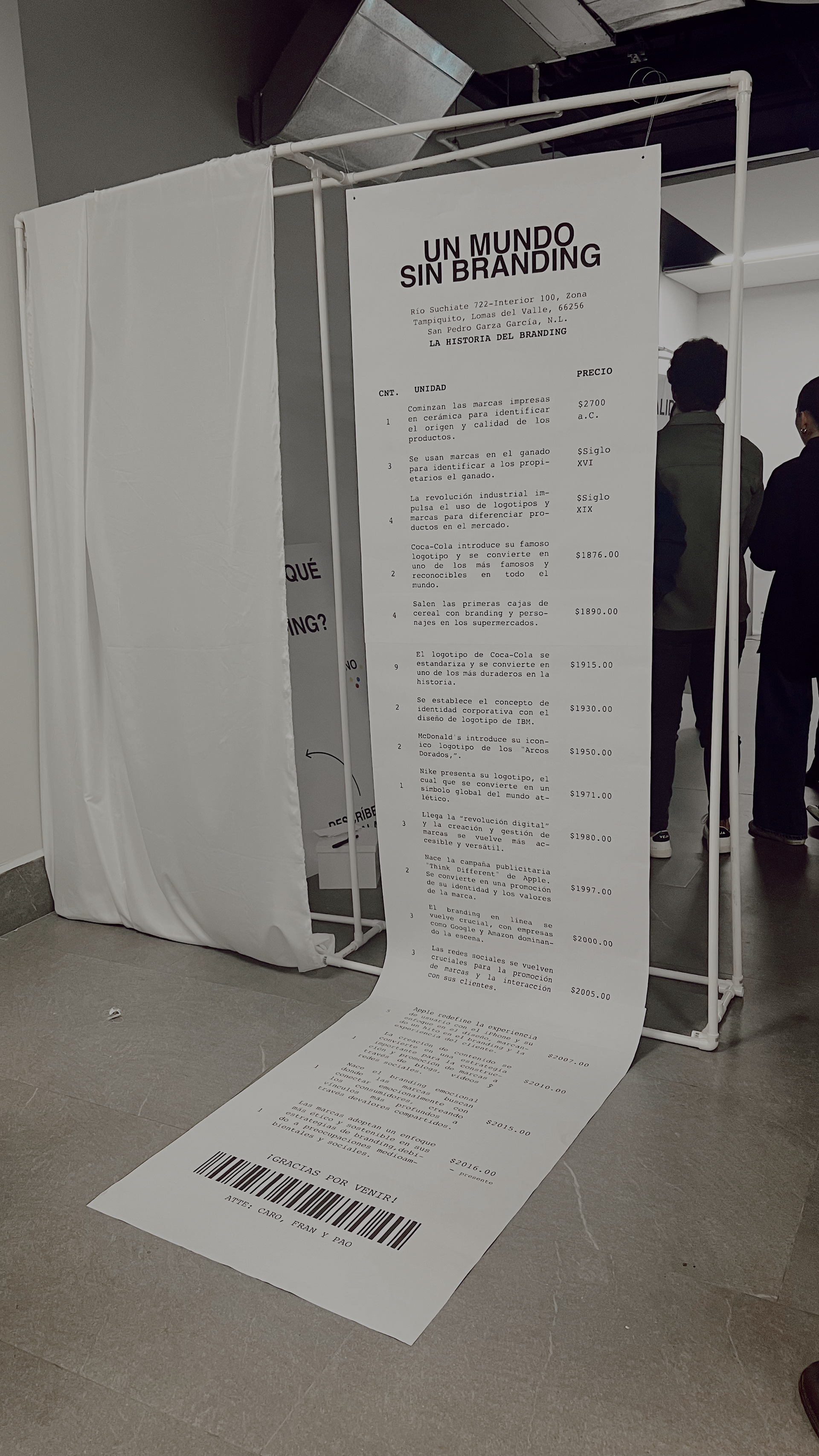 The exhibition took shape with a tour where 10 interactions were presented, each one representing a different theme of branding but together fulfilling the same objective: raising awareness about the importance of branding. We decided to end the supermarket interaction, an interactive space with which we managed to open a space for dialogue and reflection where we could demonstrate the difficulties that society would face in a hypothetical world where branding did not exist.